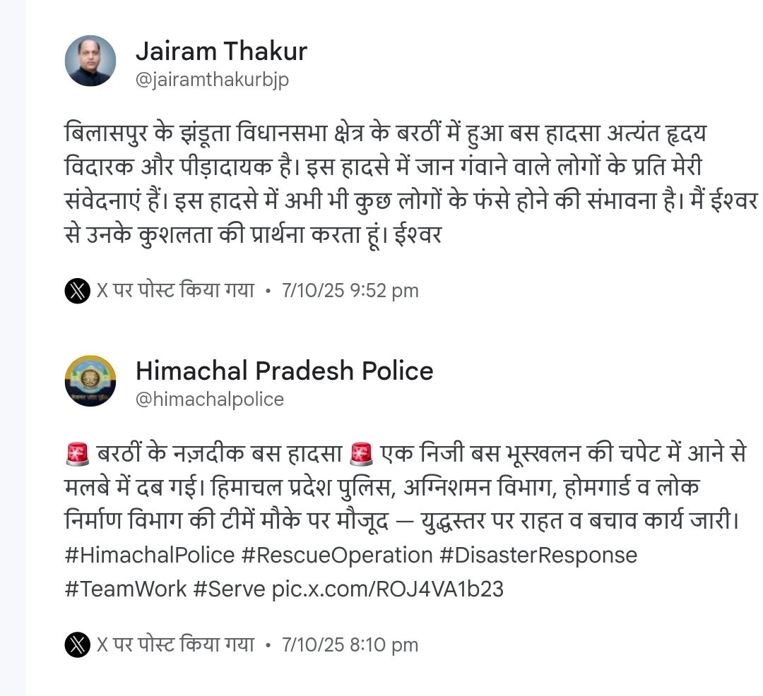 इससे पहले सीएम सुक्खू ने घटना की जानकारी देते हुए सीएम ने सोशल मीडिया प्लेटफ़ॉर्म एक्स पर लिखा, “बिलासपुर ज़िले के झंडूता विधानसभा क्षेत्र के बालूघाट के पास हुए भीषण भूस्खलन की ख़बर ने मन को भीतर तक झकझोर दिया है.”